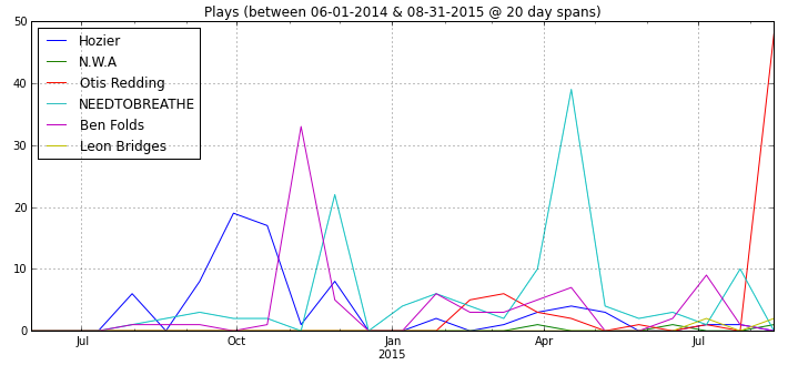 As most people do, I go through phases of musical interests. I’ll listen to one artist for a week and then switch to someone different the next. I thought it would be cool to visualize these phases and the shifts in my listening, you know, just for fun. So using Last.fm’s scrobbling data, this handy script, and some Python / pandas, I was able to see just what I was listening to over the past few years.