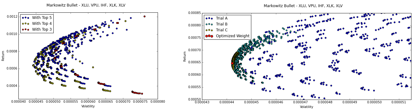 In order to reduce the risk of this fake portfolio of low variance ETFs, I used Markowitz’s modern portfolio theory to find the best weights to use for each equity. Essentially, Markowitz states that the optimized portfolio is a portfolio that lies along the “efficient frontier” (outer edge) of the Markowitz bullet (a plot of return vs. variance, examples seen below) where each point in the bullet is a different weight distribution of the same portfolio. In my situation, I wanted to reduce risk (variance) so I wanted a portfolio that would be at the left-most tip of the bullet.