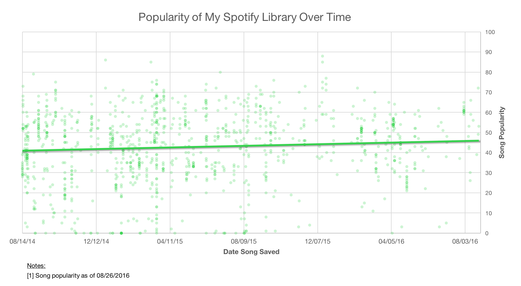 Out of curiosity, I decided to see how my Spotify library stacked up in terms of popularity. I was also curious to see if my more recent saved songs are more or less popular than my older saves (i.e. am I becoming more or less musically hipster). As a result, I got the chart below, where each of my saved songs is plotted based on when I saved the song versus the songs popularity (as of 08/26, not when I saved it).