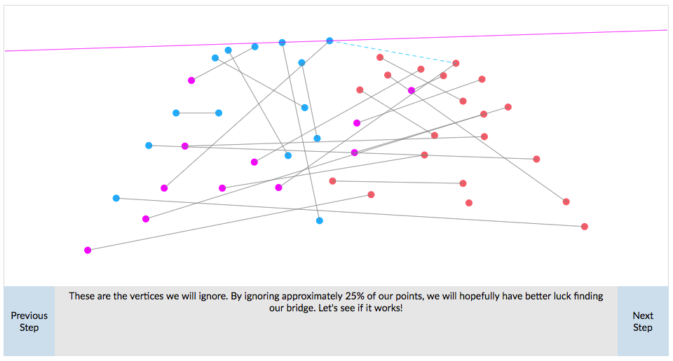 After posting the final project for my visualization course, I thought I’d share the final project for my computational geometry class as well. The course was an extended algorithms class focused on different multi-dimensional geometric problems. One of the main problems of the course deals with finding the convex hull of a set of points. There are a number ways to tackle the problem but one of the best approaches is the Kirkpatrick-Seidel Ultimate Planar Convex Hull Algorithm. In order to help teach the algorithm, I made a visualization tool to walk-through the steps.