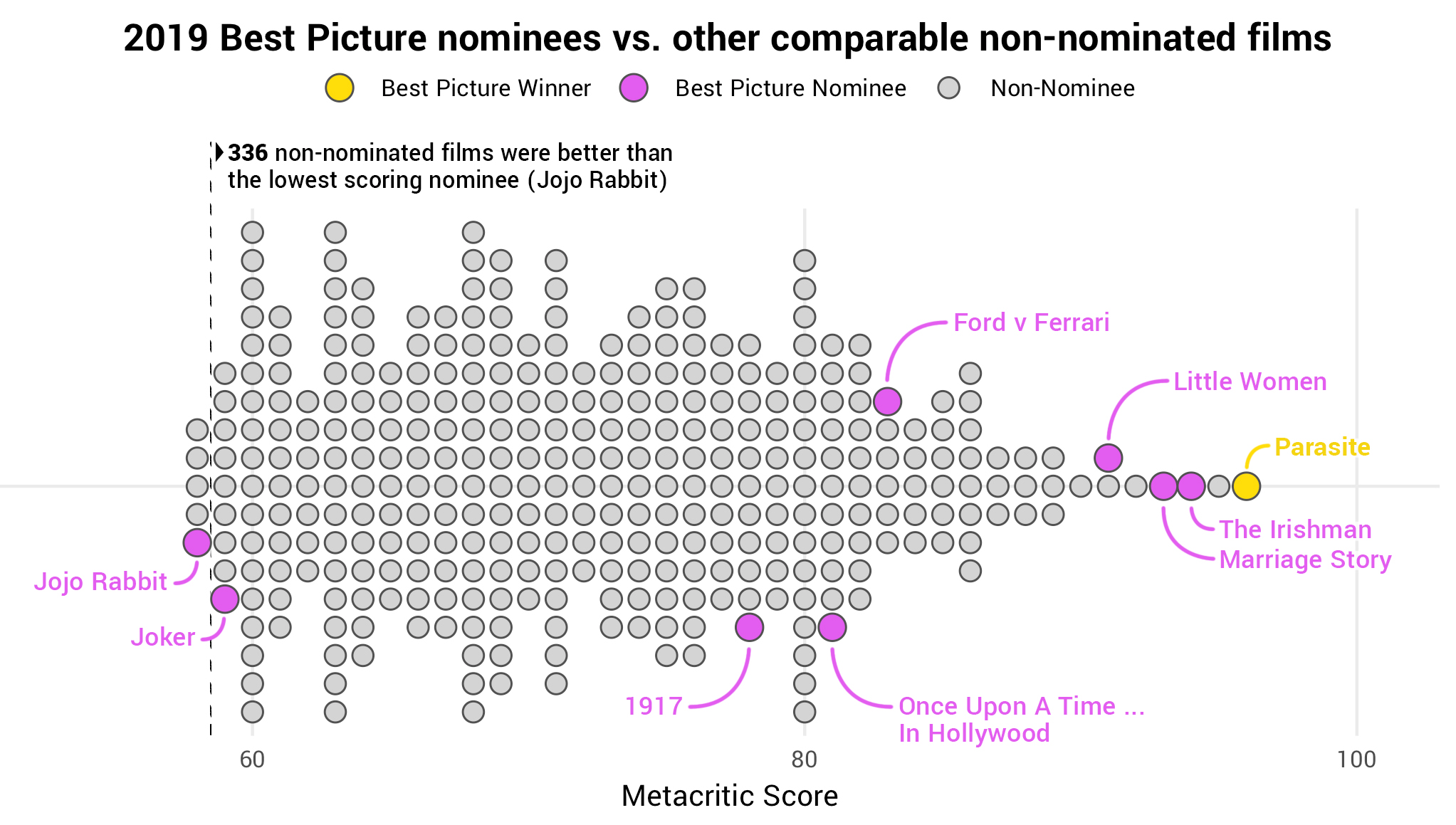 In an attempt to quantify all of this and mentally prepare myself for what I expected was going to be a loss for Parasite, midway through the Awards, I tweeted a series of charts showing the Best Picture nominees from the past few years stacked up against other comparable non-nominated films. These showed how many great films the Academy had overlooked when they made their nominations and how the eventual winners compared to those overlooked films. Though never perfect, it was clear that the Academy does a better job in some years than others. In 2016, though some of the nominees were worse than other non-nominated films, Moonlight was considered the best of the best and won the prize to prove it. On the other hand, in 2018, nominees like Bohemian Rhapsody and Vice were far inferior to many, many other non-nominees, which was only made worse by the fact that Green Book was generally considered one of the worst nominees that year.