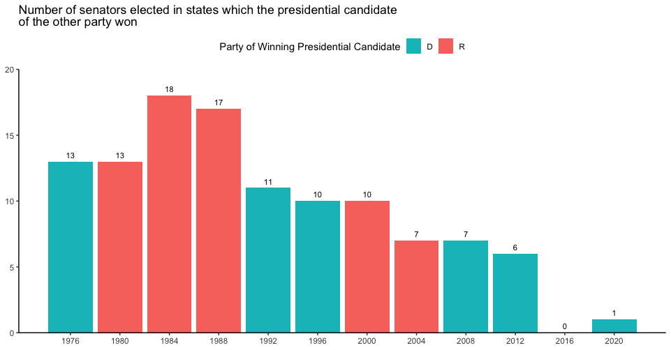 In 2021, John Dickerson tweeted about the modern rarity of what I call “split ticket senators” (e.g., a Republican senator elected in the same year their state voted for a Democrat for president), which I found interesting. I wanted to further explore the concept, which started out by using more data to look at the trend over time.