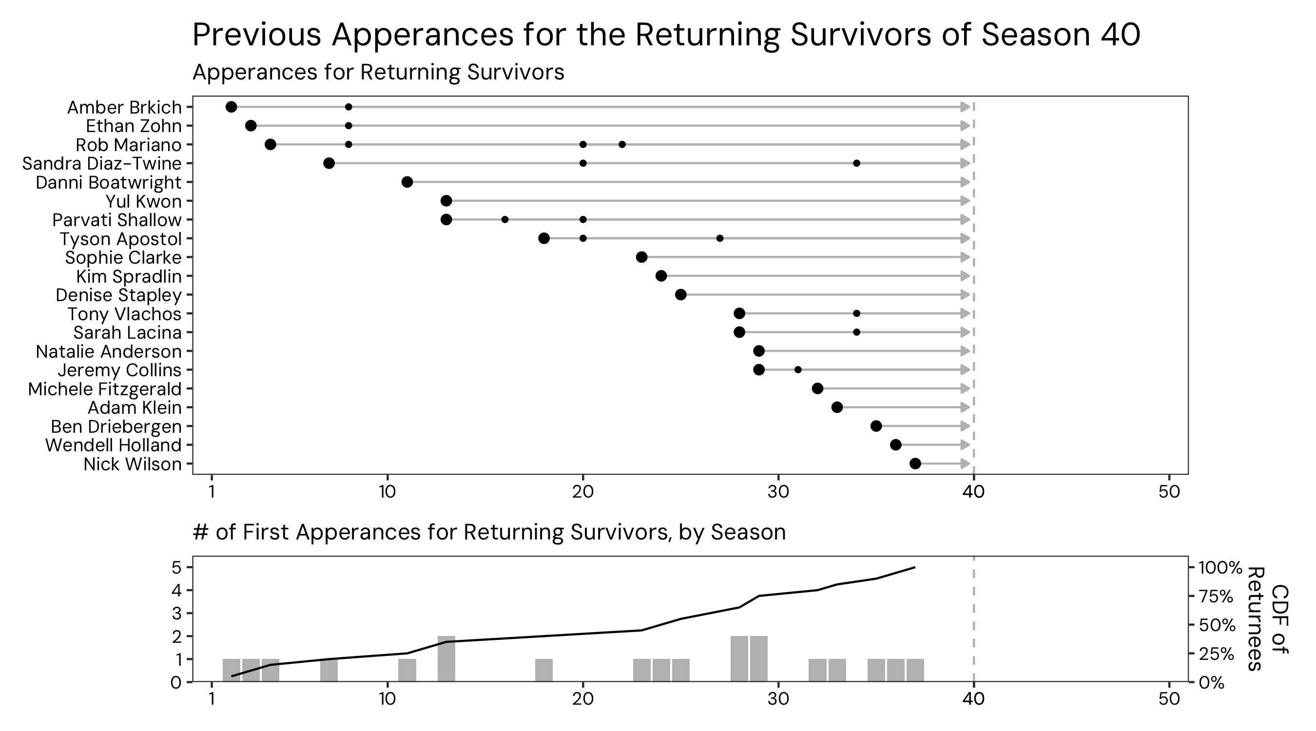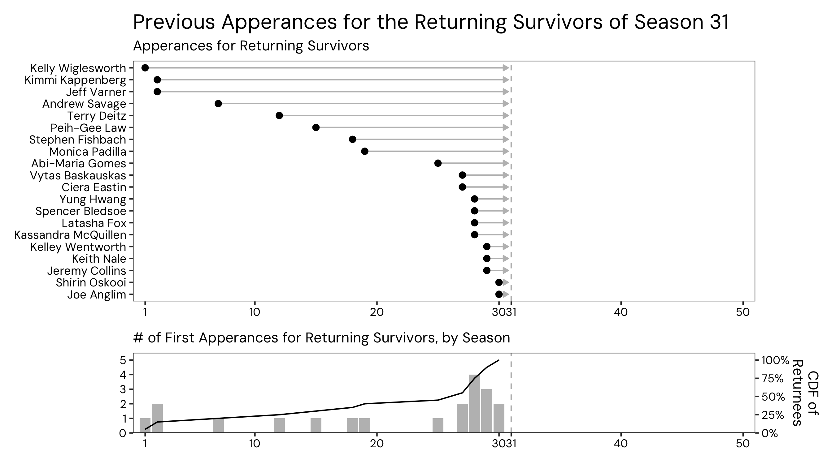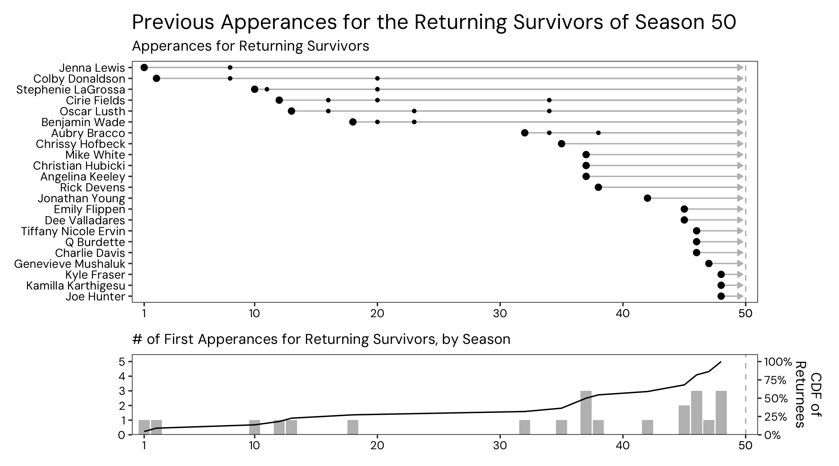 The cast of Survivor’s upcoming 50th season was announced today, and since S50 is the first season of Survivor’s “new era” (the years after Survivor’s all-winners S40, which happened to align with COVID shutdowns in 2020) with all returning players. Since the announcement, there has been discussion about how the cast of S50 has some recency bias towards the most recent seasons–in particular S48, which just finished and has 3 players representing. I decided to dig into the data a bit more, just to explore how prevalent this recency bias is.