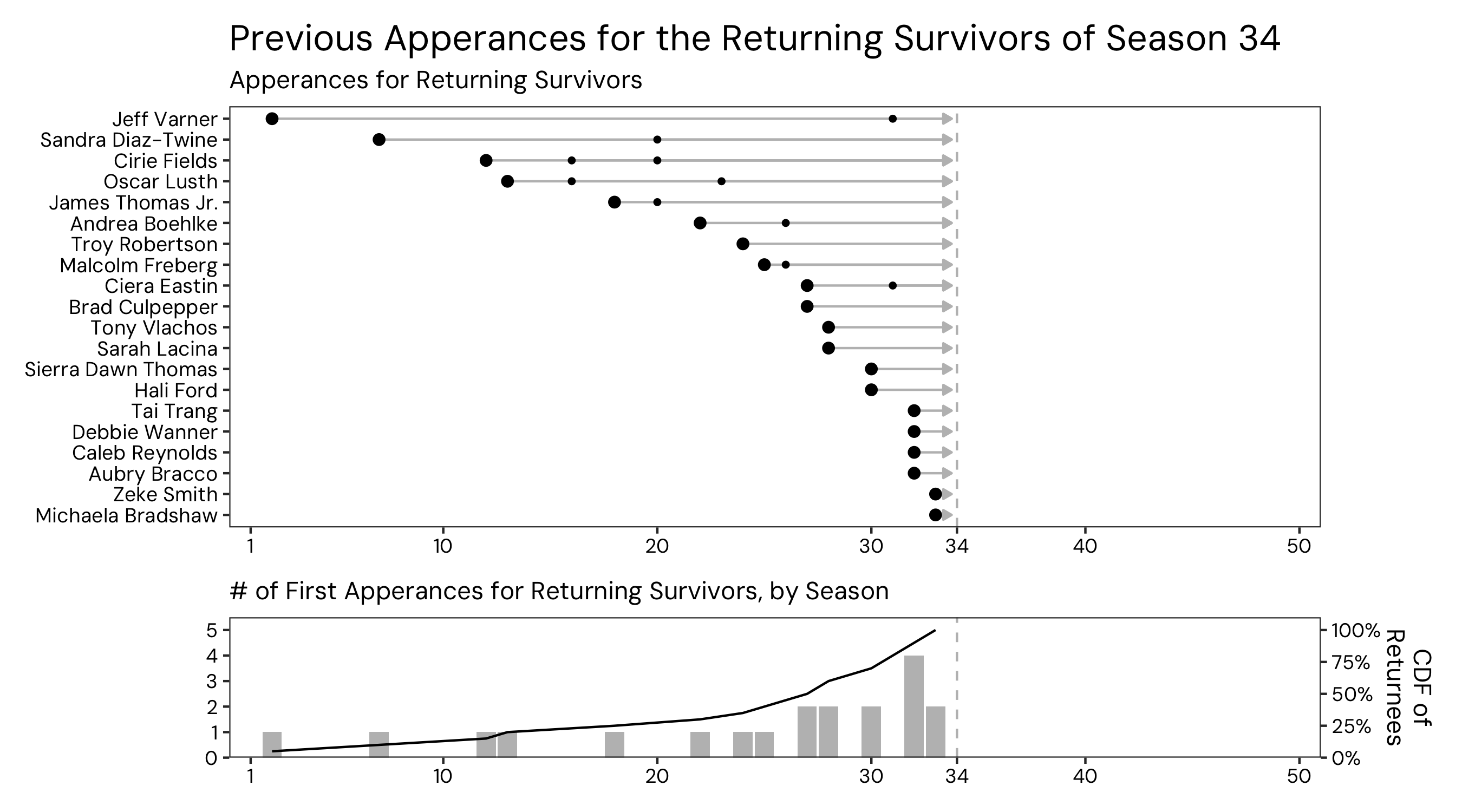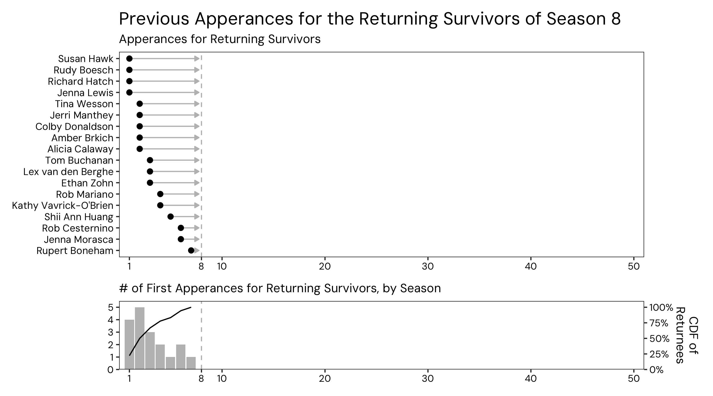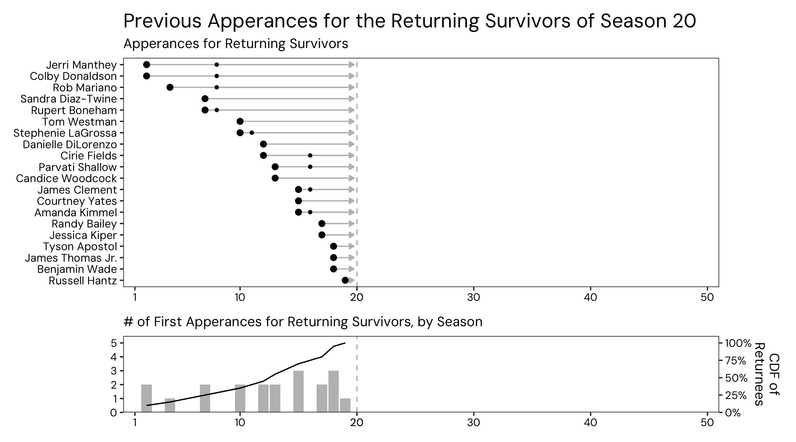 The cast of Survivor’s upcoming 50th season was announced today, and since S50 is the first season of Survivor’s “new era” (the years after Survivor’s all-winners S40, which happened to align with COVID shutdowns in 2020) with all returning players. Since the announcement, there has been discussion about how the cast of S50 has some recency bias towards the most recent seasons–in particular S48, which just finished and has 3 players representing. I decided to dig into the data a bit more, just to explore how prevalent this recency bias is.